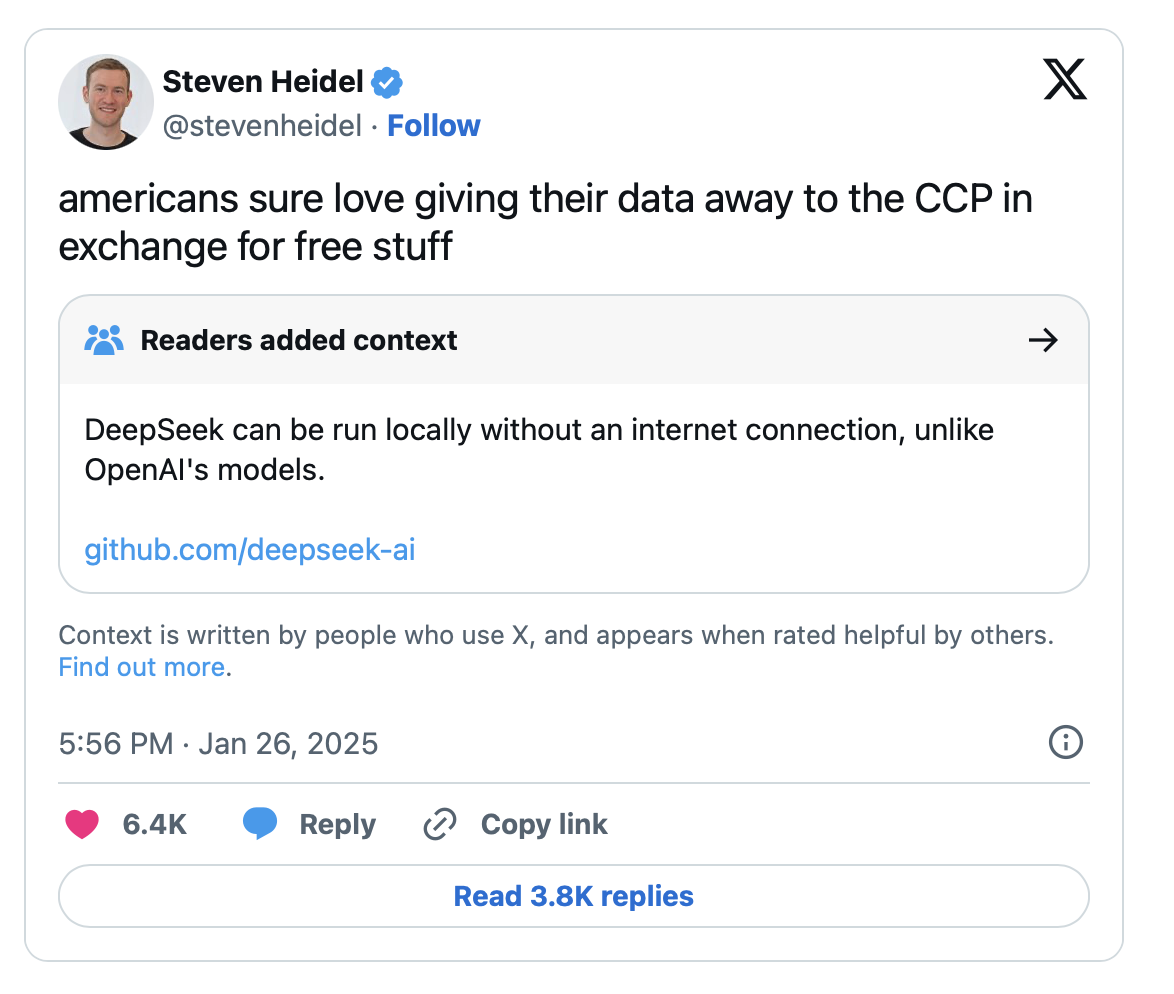 The Chinese government might be spying on you,1 but so is OpenAI,2 your car, your AI wearable, and the US government (maybe all at once). DeepSeek's servers have already had a data breach. The problem is that models like DeepSeek R1 are too large to run locally by most, and need to be run on large GPUs on the cloud. So to use the latest AI capabilities, you need to trust many third parties — all of which have the ability to see, collect, sell, and use your private data, even if they "pinky promise" to you that they won't!
