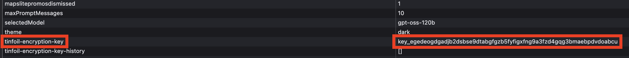 Figure 2: Encryption key stored in browser local storage, accessible to the application for client-side encryption and decryption operations.